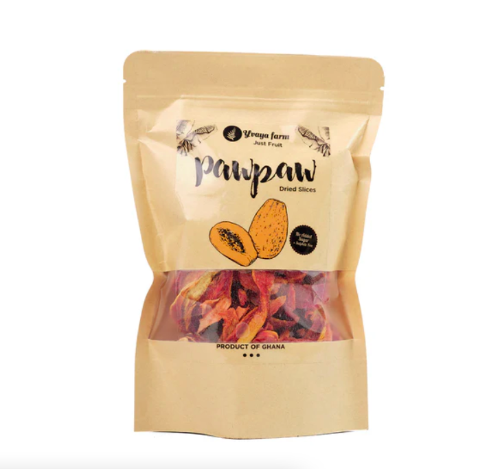 Yvaya Farm Dried Pawpaw (papaya) comes from the nutrient rich fields of Ghana’s Eastern Region. Semi-sweet and full of dietary fibre, this naturally dried fruit will give you a boost of energy while also lowering your cholesterol and keeping your bowel movements regular…!